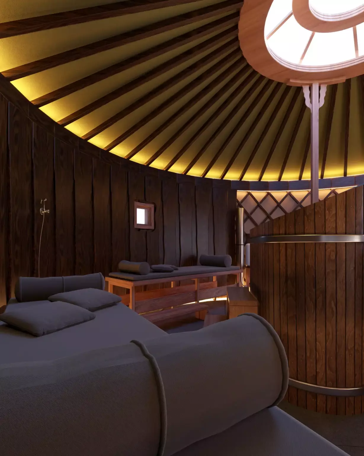 Купольная баня в классической юрте от «Юрты Кавказа» — это архитектурный и эмоциональный акцент, который усиливает ценность премиального глемпинга. Мы создаём уникальные парные пространства, где традиционная форма юрты сочетается с высоким уровнем комфорта и продуманной эргономикой.