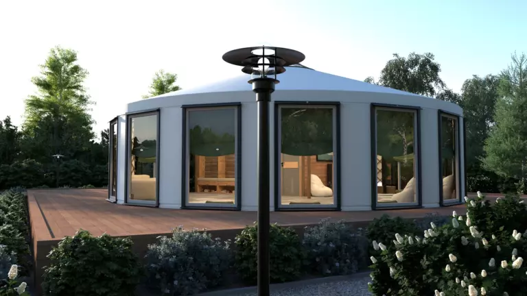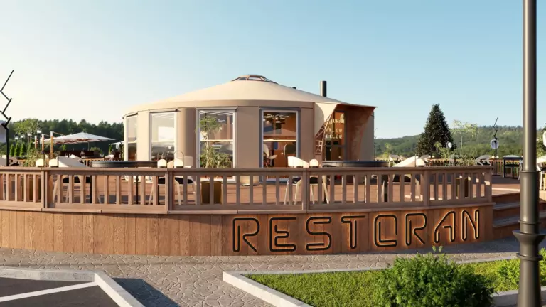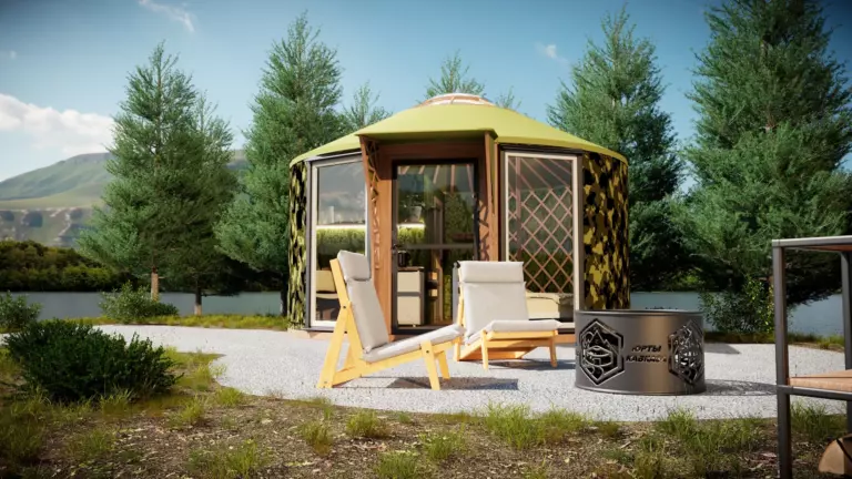 Сборно-разборная юрта площадью до 75 м² собирается всего за несколько дней. Без сложного фундамента и подготовительных работ — идеально для горного склона, лесной поляны или дачного участка. Круглая планировка даёт полную свободу: от уютного дома до креативного рабочего пространства. Для ценителей стиля — оформление внешних стен авторскими принтами.